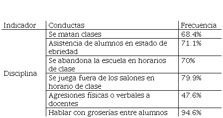 La tabla 9 señala los resultados obtenidos para el indicador de conflicto disciplina la cual se caracteriza por conductas aceptadas tales como: matar clases (no asistir a clases todo el grupo) en un 68:4%, asistencia de alumnos en estado de ebriedad 71.1%, abandonar la escuela durante las clases 70%, jugar en salones en horarios de clase 79.8%, agresiones a docentes ya sean verbales o físicas 47.6%, hablar con groserías o pablaras altisonantes en la escuela con otros compañeros 94.6%. Estas conductas representan el romper las reglas establecidas en reglamentos escolares e institucionales, mismas que alteran la convivencia y generan conflictos ya sea con los compañeros o con los docentes .Ya que son faltas de respeto incluso considerados graves y con cierto grado de violencia.