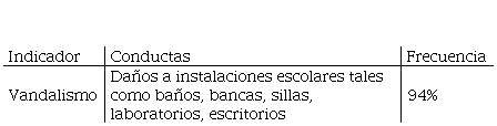 Estos resultados concuerdan con la información obtenida en las entrevistas, ya que los alumnos refieren que el vandalismo es común en los espacios académicos, manifestándose a través de pintar o rayar los pupitres, las paredes de baños, anuncios, y en ocasiones se dañan los equipos multimedia, se comenta que suele ser un acto que se realiza al sentir aburrimiento durante las clases o cuando desean manifestar una idea.