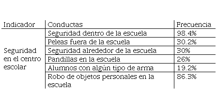 La tabla 2, muestra la frecuencia de opiniones sobre los conflictos relacionados a la seguridad dentro y al redor del centro escolar por parte de los estudiantes de nivel medio superior de la UAEMéx, indicando que el 98% de los sujetos se sienten seguros dentro de la escuela a pesar de reportar un 86.3% que se presentan robos de objetos personales, el 26% manifiesta que existen pandillas y el 19.2% han observado alumnos con armas, por otra parte indican que se sientes inseguros fuera de la escuela un 30% en los alrededores de la misma, ya que han observado en un 30.2% peleas fuera.