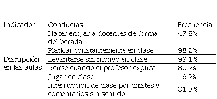En la tabla 3 se muestran los resultados del indicador Disrupción en las aulas, mismas que se manifiestan a través de conductas tales como: hacer enojar a los docentes de forma deliberada, que se reporta en un 47.8%, Platicar en clase, siendo la de mayor incidencia con 98.1%, levantarse sin motivo 98.1%, reiré mientras el profesor explica 80.2% y jugar en clase con 19.2%. Lo anterior implica que los alumnos tienen conductas disruptivas las que tienen como finalidad conocer los límites del docente, llamar la atención de este, interrumpir para ser tomado en cuenta. Sin embargo, no es considerado como acto de violencia a menos que sea recurrente. La disrupción en las aulas constituye la preocupación más directa y la fuente de malestar más importante de los docentes, por las interrupciones constantes de la clase y que entre alumnos que están interesados en la clase también, confundido con la disciplina en el aula.