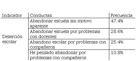 En la tabla IV se puede observar el indicador Deserción escolar, que muestra el porcentaje de respuesta con algún grado de acuerdo, por parte de los alumnos que respondieron el cuestionario. Este se midió a través de cuatro reactivos. Respecto a si han conocido algún compañero (a) que abandono la escuela son motivo aparente reportan un 47.4%, si algún compañero (a) ha abandonado la escuela por problemas con docentes en 28,6% abandono por problemas con otros compañeros 25.4 y si han considerado abandonar la escuela por problemas con compañeros en un 10.8% A pesar de considerarse porcentajes bajos el hecho de que los estudiantes perciban el abandono escolar por problemas con compañeros, docentes y que pudieran hacerlo indica que los conflictos entre los actores institucionales está relacionado con el abandono escolar.