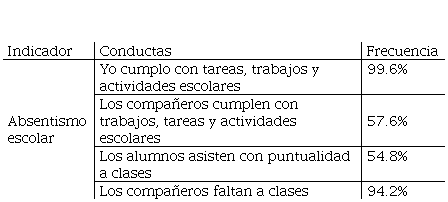 La tabla 5, muestra los resultados del indicador Absentismo escolar donde los sujetos mostraron respuestas de estar de acuerdo con las conductas relacionadas en el cumplimiento de tareas y trabajos escolares en un 98.6%, sin embargo, opinan que el 57.6% de sus compañeros no lo hacen, que faltan a clases en un 92.2% y que quienes lo hacen con puntualidad es en un 54:8% Lo que indica que los alumnos se abstienen en cumplir con sus actividades como estudiante, si bien estas no afectan de forma contundente la convivencia o no resultan ser un grave conflicto de manera personal, pueden estar determinados por la motivación que tiene los estudiantes hacia la escuela y se relacionan con el abandono escolar.