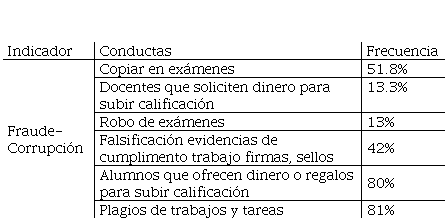Asimismo se ubica el aprendizaje de conflictos relacionados con el fraudecorrupción, si los alumnos observan a otros compañeros, falsificar firmas, sobornar a docentes, copiar en exámenes, etc., reproducirán las mismas conductas, ya que la experiencia se ubica en que las consecuencias son positivas y se reportan en obtener mejores calificaciones y beneficios académicos ya que la reglamentación no se aplica, lo que seguirán reproduciendo y generalizando otros ámbitos de si vida.