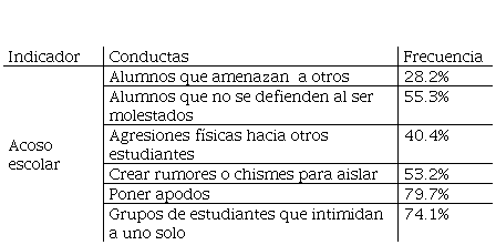 En la tabla 7 se ven reflejados los porcentajes de aceptación de las conductas que se relacionan con el acoso escolar en los estudiantes participantes en la investigación. El 28.2% aceptan que han observado como un grupo de alumnos amenaza a otro u otros estudiantes, sin razón aparente, en 55.3% los alumnos que son molestados por otros, Un 40.4% ha sido testigo de agresiones físicas de un estudiante o grupo de estudiantes hacia otro estudiante., aceptan que se crean rumores con la finalidad de aislar a otro estudiante en un 53.2%, respecto a colocar apodos la incidencia se presenta en un 79.7/% y aquellos alumnos que son molestados o intimidados por un grupo es del 74.1%. Este conglomerado de conductas se presenta de forma alta, mismas que ocasionan conflictos que implican violencia y que se relacionan en gran medida con la deserción escolar o con las intenciones de abandonar la escuela.