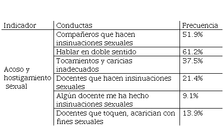 Al abordar estos puntos se pudo identificar que los estudiantes no quisieron revelar todo lo que han visto, escuchado o vivido, a pesar de esto se mencionó que si existe el acoso sexual, principalmente por parte de los maestros, y se da a través de miradas, comentarios, albures e incluso frotar o masajear su espalada, a lo que algunos alumnos responden con incomodidad y miedo, pero otros comentan que “por pasar la materia harían lo que fuera”; además existen rumores de que alumnas que han salido con maestros. Mientras que el caso del hostigamiento sexual se ve enmascarado de bromas, pero en ocasiones si es muy evidente que las hostigue un compañero y prefieren cambiar de salón, muy pocas veces lo confrontan.