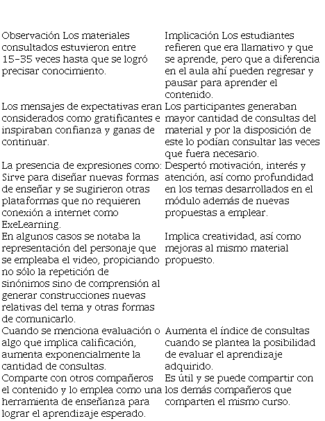 Los estudiantes en el grupo asignado tuvieron un reflejo en su rendimiento académico mediante una prueba escrita y de resultados previstos con parámetros que permiten medir el aprendizaje una diferencia de entre 0.6 a 1.0 puntos en total, mismo que implica un impacto inmediato, esto al referirse como un material que es capaz de mantener el interés, la atención y motivación en el sentido que se elaboró en primera persona, basado en la combinación de teorías de Roberth Rosenthal y Albert Bandura, entre aspectos observados es que en ocasiones imitaban el material reconstruyendo el contenido que significó la comprensión y expresión en diferente modalidad. Otro punto es que la cantidad de consultas es elevada entre 15-25 veces registrados en el sistema, que permitía la retroalimentación y como guía para adquirir el conocimiento en diferentes niveles de dificultad, agregando que este mismo era compartido por otros compañeros que llevaban el mismo curso como material de apoyo.
