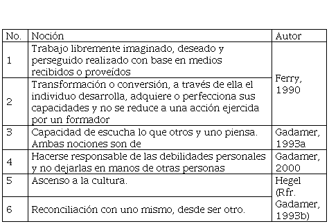 Desde la perspectiva de Gadamer -filósofo alemán y padre de la hermenéutica filosófica-, la formación no se centra en la capacidad de repetir y recordar. La formación está vinculada con diversos aspectos, entre ellos se encuentran: experiencias hermenéuticas, estéticas y del tú, historia efectual, juego, vivencia, lenguaje, tradición, el juego, etcétera. En síntesis, al vivir se dejan huellas imborrables que caracterizan la forma de ser del individuo sin que este olvide lo que ha sido anteriormente (Gadamer, 2000).