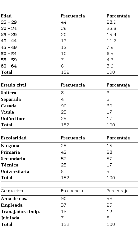 De acuerdo al estudio realizado se encontraron los siguientes datos sociodemográficos: la edad con mayor frecuencia fueron las mujeres en edad reproductiva, de 25 a 29 años, con un 28.9%, de 30 a 34 años un 23.6%, de 35 a 39 años el 13.4% y solo con un 3.9% de 60 a 64 años de edad. El estado civil que predominó en la comunidad estudiada fue casada, con un 60%, y el de menor porcentaje fue el de separada con un 5%. El nivel de escolaridad en el que se encuentran la mayoría de las encuestadas fue Secundaria, con 37%, y solo un 3% cuentan con carrera universitaria; En relación a la ocupación el 58% es ama de casa y solo el 5% son jubiladas. (Tabla 1)