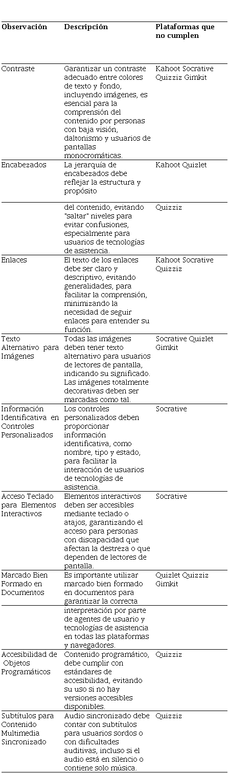 La Tabla 3 identifica las áreas donde las plataformas fallan en términos de accesibilidad visual: