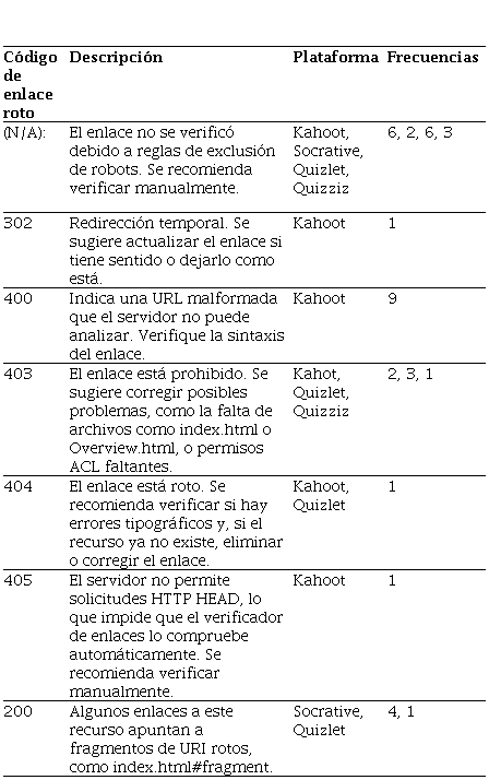 La Tabla 4 muestra la verificación de enlaces rotos en las plataformas utilizando el validador de enlaces de W3C:
