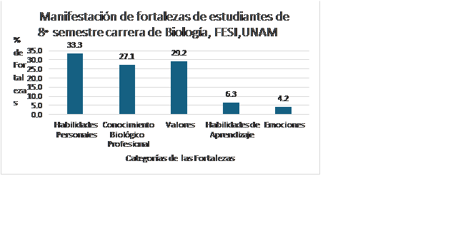 Grafica 1. Manifestaciones de las fortalezas de estudiantes de 8vo. Semestre de la carrera de Biología FESI, UNAM. n= total de fortalezas enunciadas 48