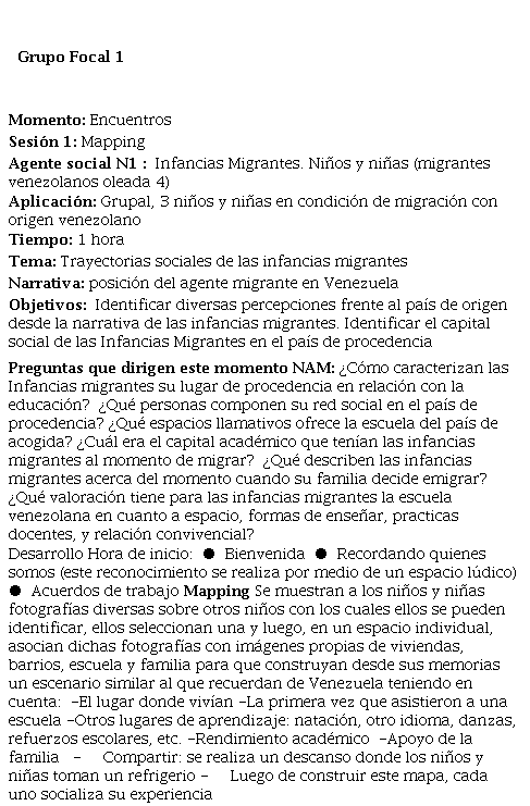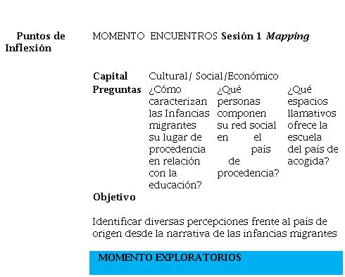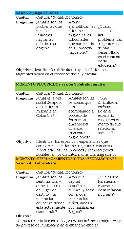Etapa dos: la información recopilada, junto con los previos del estudio, se reunieron para hacer de los cuatro momentos NAM espacios pertinentes para el diálogo, la reflexión y la interpretación de las narrativas en las infancias migrantes.