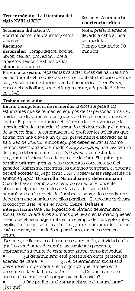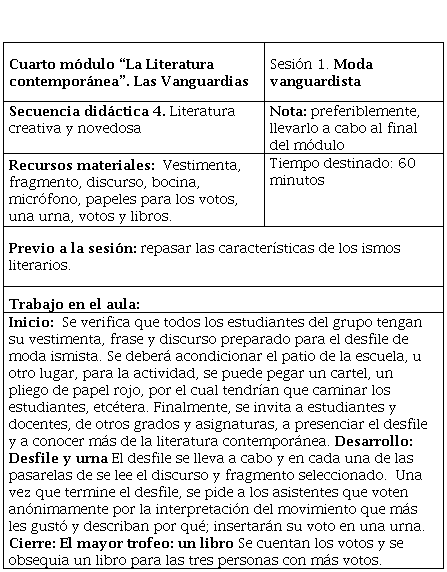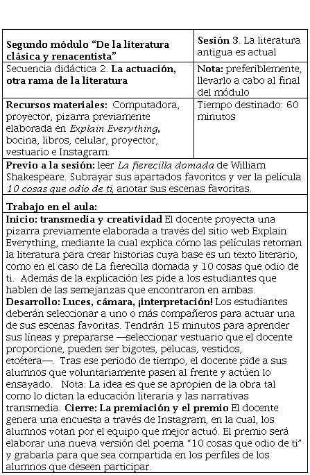 La estrategia consta del diseño de ocho sesiones, las cuales corresponden a cada uno de los módulos del programa de asignatura, donde la exploración de los textos se hará desde las distintas herramientas digitales (las redes sociales; plataformas digítales, etcétera) y, de una manera más tradicional, con películas y series. Asimismo, se implementarán dinámicas lúdicas que, vinculadas con la tecnología, logren involucrar a los alumnos con la literatura, por lo cual, se infiere que, adicionalmente al fomento del gusto por la lectura, se busca que regresen al texto y éste se convierta en una historia que se quede en su memoria como un recuerdo entrañable.