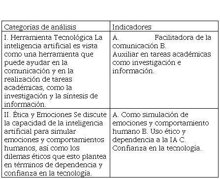 En la segunda etapa se concertó una sesión de grupos focales por cada universidad. A partir de las respuestas dadas por los alumnos seleccionados para este segundo momento, detectamos cuatro categorías de análisis que usamos como guía para un diálogo con los participantes del grupo focal (IA como herramienta, IA como un riesgo, IA como un avance. IA como herramienta lúdica). Frey y Fontana (1991) comentan que en los grupos focales: