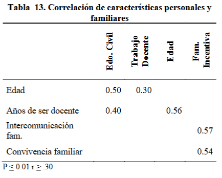 Ela tabla 13, se observa que los sujetos que están solteros son los de menor edad. Tienen en promedio pocos años de ser docentes y tienen una mayor incentivación por parte de la familia, por lo tanto, tienen una mayor convivencia e intercomunicación familiar.