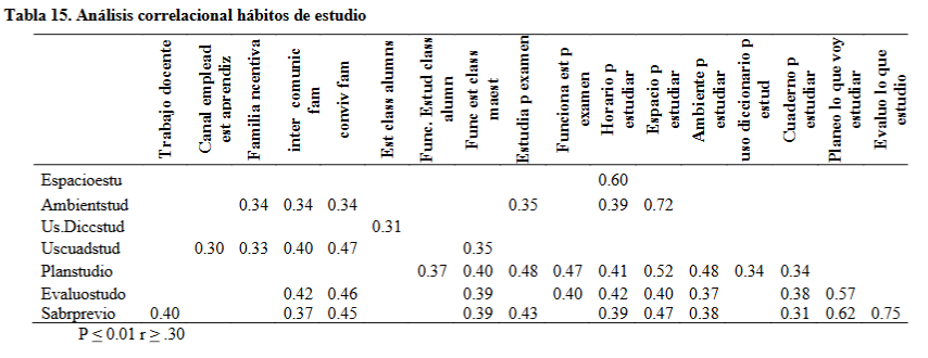 Una vez terminada la investigación en el análisis univariado (tabla 4) y correlacional (tabla 15) “Hábitos de estudio”, se encuentra: los alumnos que estudian, les funciona y obtienen rendimiento escolar alto, tienen hábitos de estudio como: ambiente, espacio y horario específico; adoptan estrategias como: planear, usan diccionario, revisan saber previo, evalúan; coincidiendo así, con los autores Maia H., Maia M., Dornelles E. (2012), quienes refieren: “cada estudiante adopta la estrategia o el hábito de estudio de acuerdo con sus necesidades y que, no hay mejores o peores estrategias de aprendizaje, sino que, deben ser adecuadas a la actividad que se aprende” (p.4). Se suma a ello, lo referido por Hernández, Rodríguez y Vargas (2012), quienes consideran importante la combinación entre las estrategias y hábitos de estudio que los alumnos elijan para llevar a cabo el proceso de aprendizaje.
