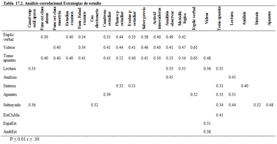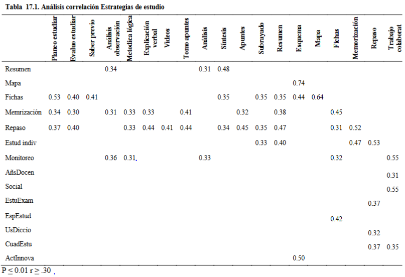 Respecto a lo mostrado en el análisis descriptivo (tabla 6) y de correlación (tabla 17.1 y 17.2), “Estrategias de estudio” los investigados con mayor rendimiento académico y que les funciona estudiar lo hacen empleando diversas estrategias de aprendizaje como: lectura, análisis, sintetizan, subrayan, hacen esquemas, fichas, mapas conceptuales, toman apuntes, usan videos, aprenden mejor observando, con actividades innovadoras, usando metódica y lógica, evalúan, entre otras; en contraste con lo encontrado por Mercado-Elgueta, IllescaPretty y Hernández-Díaz, (2018), los estudiantes hacen uso de diversas estrategias para su aprendizaje, sin puntualizar en el uso específico de algunas, por lo que, no existe una consistencia entre estrategias de aprendizaje y rendimiento académico. Entre las estrategias que seleccionan, atienden aspectos cognitivos y socio afectivos, señalando para los cognitivos entre otros: subrayar, repaso, lectura, visualizar contenido previo, memorizar y para el socio afectivo, trabajo colaborativo, actitud, interés y ambiente para estudio.