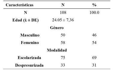 La matrícula del cuatrimestre abril-mayo 2018 de estudiantes de TSUP es de 182, el 66% (120) en modalidad escolarizada y el 62% (34) en despresurizada. La encuesta se aplicó mediante formularios Google en el Laboratorio de Informática del edificio 4 de la Universidad Tecnológica del Valle de Toluca. De los cuales participaron 108, lo que corresponde al 59% del total de alumnos, 75 estudiantes escolarizados (69%), 58 pertenecen al género femenino (54%), con edad promedio de 24.05 ± 7.36 años (tabla 1).