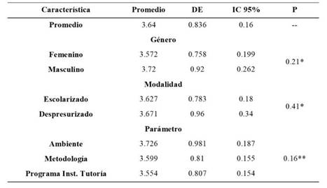 En la Tabla 2, se muestra los promedios obtenidos por parámetro evaluado, el promedio general es de 3.64 ± 0.83, el cual fue usado como punto de corte de satisfacción, no hubo diferencia significativa en ningún de los parámetros evaluados: los promedios fueron de 3.72 ± 0.98 para ambiente, 3.59 ± 0.81 a metodología y con 3.55 ± 0.80 al programa institucional de tutoría. En cuanto al género y la modalidad, no hubo diferencia significativa.