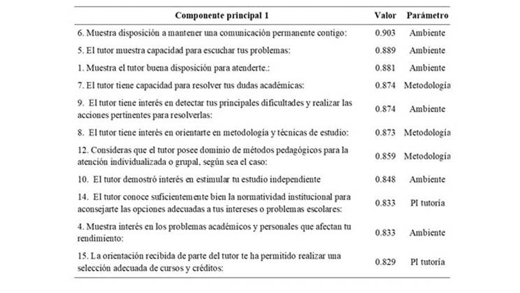 Se realizó un APC y rotación varimax (KMO = 0.96, χ2=2194.881, p< 0.001), se obtuvieron 2 componentes, sin embargo, el primer componente explica el 65% de la variabilidad, los estudiantes consideran que la disposición a mantener una comunicación permanente (0.903), capacidad para escuchar problemas (0.889), y muestra el tutor buena disposición para atenderte (0.881) pertenecen al parámetro de ambiente. 9 interés en detectar tus principales dificultades y realizar las acciones pertinentes para resolverlas (0.874), y capacidad para resolver dudas académicas (0.874), son importantes para el desarrollo de la tutoría (Tabla 3).