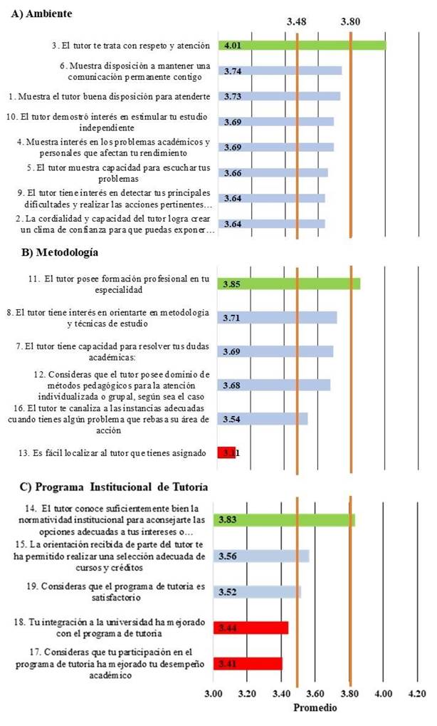 Se destaca que en cada parámetro se observa una fortaleza siendo la del tutor te trata con respeto y atención la que tiene el promedio más alto (4.01 ± 1.081) del parámetro ambiente (fig. 1A), seguida del tutor posee formación profesional en tu especialidad (3.85 ± 0.935) de metodología (fig. 1B) y por último, referente al programa institucional de tutorías (fig. 1C), el tutor conoce suficientemente bien la normatividad institucional para aconsejarte las opciones adecuadas a tus intereses o problemas escolares fue el ítem con mayor promedio (3.83 ± 0.942).
