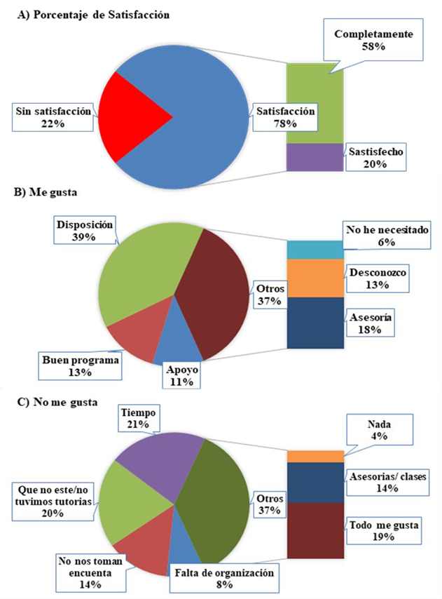 Cabe destacar que el ambiente, no presentó área de oportunidad (fig. 1A). El 78% de los estudiantes se encuentra satisfecho con las tutorías, destacando que el 58% lo está completamente (fig. 2A). En cuanto a lo que les gusta, el 39% opinó que la disposición, seguido de que consideran que es un buen programa con un 13% (fig. 2B). Y lo que no les agrada de la tutoría es la falta de tiempo para misma con un 21% y que el tutor no esté o no se presente con un 20% (fig. 2C).