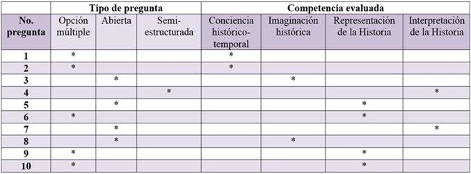 Posterior a esta evaluación se aplicó una segunda después de cuatro estrategias trabajadas, pero en esta ocasión fue centrada al tema de la Edad moderna (el renacimiento), en el cuestionario se retomaron todos los temas vistos hasta ese momento, cada una de los cuestionamientos incluidos en la evaluación, representó un tipo de pregunta (opción múltiple, abierta o semiestructurada), y va enfocada a evaluar una de las cuatro competencias del pensamiento histórico; es importante resaltar que cada una de las competencias tuvo dos preguntas a excepción de la competencia representación de la Historia en donde hubo cuatro preguntas, como se observa en la tabla 6.