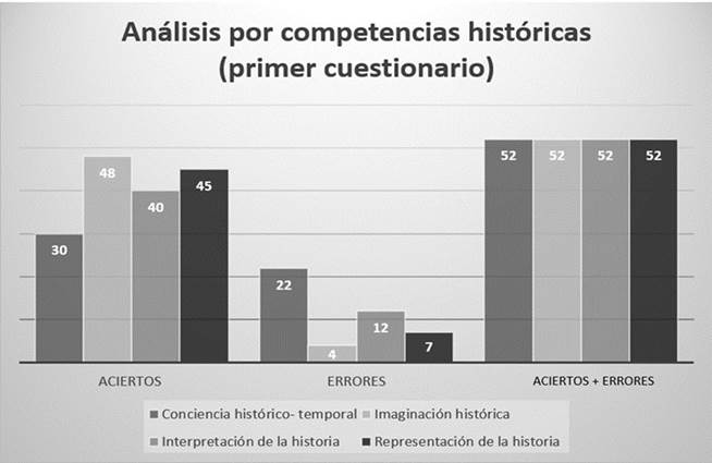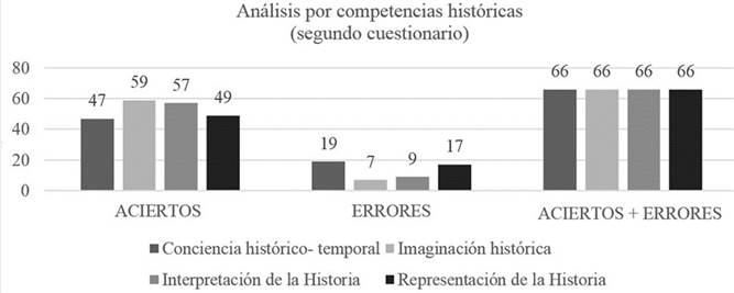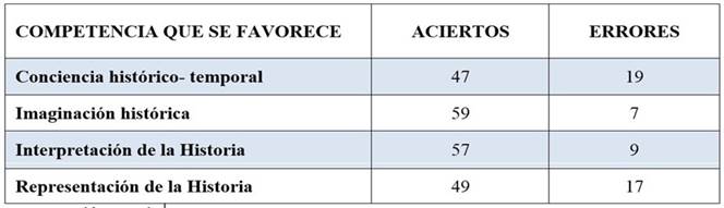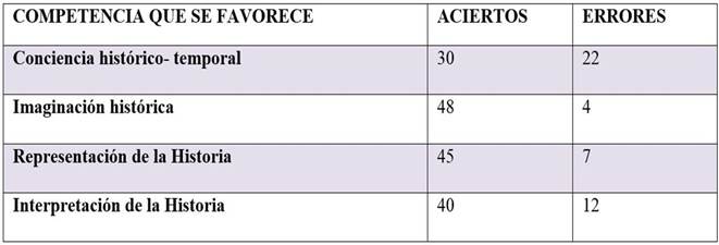 Toda vez aplicado el cuestionario, se realizó el análisis a partir del cálculo de frecuencia de error de cada una de las preguntas; obteniendo el número de aciertos y errores de cada competencia del pensamiento histórico, permitiendo en consecuencia concluir cual es la más desarrollada y cuál se encuentra con un menor nivel de desarrollo. A continuación, se muestra el concentrado de aciertos y errores de cada una de las competencias del pensamiento histórico: