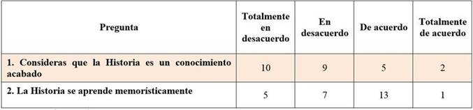 Como se puede ver en la tabla 8, 19 alumnos consideraron que la Historia no es un conocimiento acabado, que este sigue evolucionando conforme avanza el tiempo y se puede modificar a partir de los nuevos descubrimientos. En cuanto al indicador referente a que la Historia se aprende memorísticamente, 14 estudiantes están de acuerdo, se concluye que estas respuestas se deben a que en el aprendizaje de la Historia tradicionalmente se promueve la memorización y la enseñanza se centra en la lectura y subrayado del libro de texto, por el poco tiempo que se destina a la asignatura dejando de lado estrategias que desarrollen el pensamiento histórico.