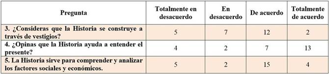 Los resultados recabados muestran que 14 de los alumnos consideran que la Historia se construye a través de vestigios. Además de que 20 de los alumnos encuestados consideran que la Historia ayuda a entender el presente, por lo tanto, se concluye que los alumnos comienzan a generar el pensamiento histórico, ya que le encuentran utilidad a la Historia.