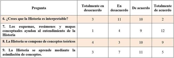 Cabe señalar que lo más relevante de estos cuatro puntos se sitúa en los aspectos referentes a si la Historia está compuesta de conceptos teóricos y si se aprende mediante asimilación de conceptos, en donde en promedio 67% de los estudiantes manifiestan estar de acuerdo, por lo que se anticipa la mirada del investigador a la conclusión de que los alumnos no pueden considerar a la Historia como una disciplina que les permita analizar, interpretar y llegar a conclusiones que les dé la oportunidad de apropiarse de los acontecimientos, debido a que según Alfageme, (2010), en todas las evaluaciones de su vida estudiantil, son las habilidades memorísticas las que más predominan.