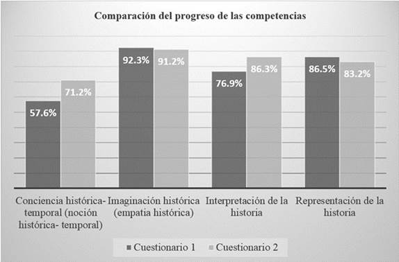 En la gráfica número 3, se muestra una comparación del desarrollo de las competencias del pensamiento histórico que menciona Santisteban (2010), esto a partir de los cuestionarios aplicados a los alumnos.