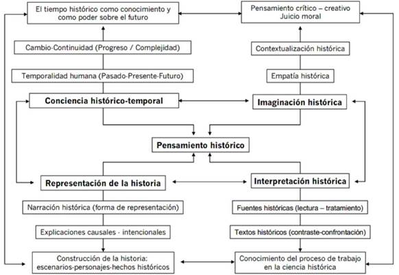 “relaciona pasado, presente y futuro, desde una serie de procedimientos mentales básicos, como la percepción de otro tiempo como diferente, la interpretación de los cambios y continuidades, la orientación y la motivación para la acción en la práctica… se despliega entre los que ha sucedido, lo que está sucediendo y lo que sucederá” (pp. 40-41).