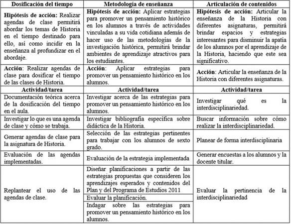 Para aplicar la metodología de investigación acción se consideraron 3 campos de acción: dosificación de tiempo, metodología de enseñanza y articulación de contenidos, cuyo planteamiento metodológico se presenta en la tabla 1, considerando las hipótesis de acción, las acciones y actividades realizadas para transformar la práctica.