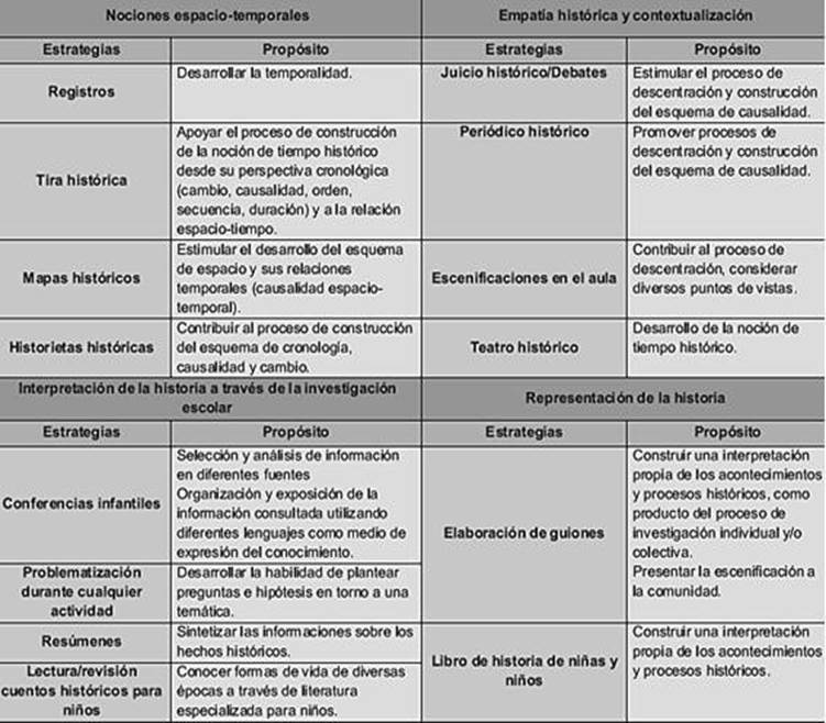 M. (2014), quien en su documento titulado El desarrollo del pensamiento histórico. Entre lo posible y lo deseable en la enseñanza de la Historia, retoma el Proyecto Educativo Paidós (2012), en el cual se plasman estrategias que contribuyen a las diferentes competencias del pensamiento histórico, como se muestra en la tabla 2.