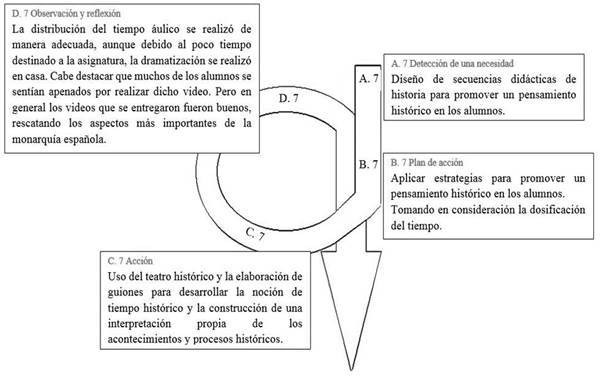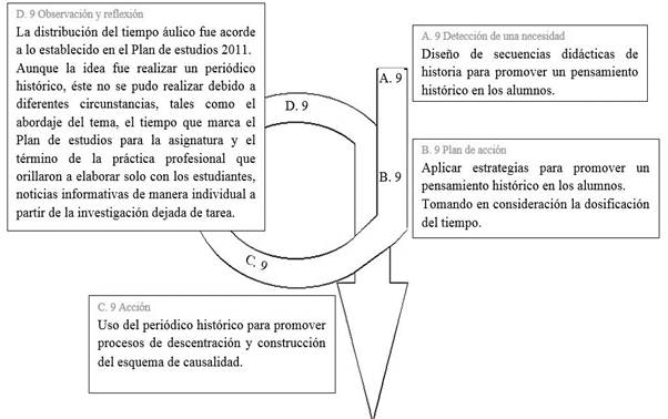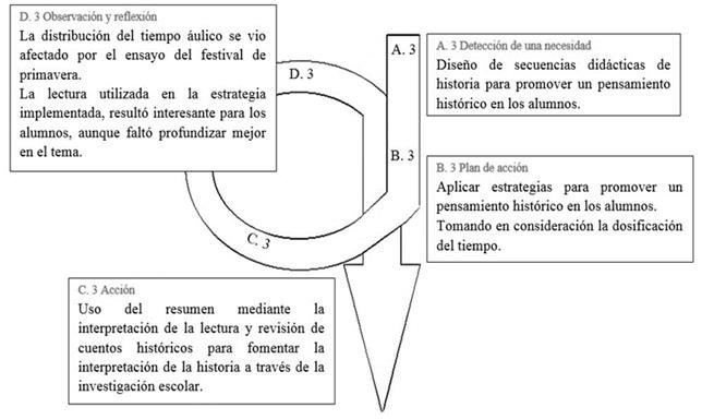 Para llevar a cabo la inmersión en el aula con el propósito de transformar la práctica, que conduzca a procesos de enseñanza que promuevan el pensamiento histórico en 1.5 horas semanales, fue de vital importancia emplear como metodología a la investigación-acción, ya que esta permite la reflexión en espiral que conduce a la transformación áulica.
