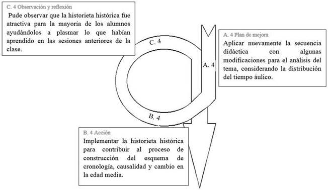 El plan de mejora consistió en aplicar nuevamente la secuencia didáctica con algunas modificaciones para el análisis del tema, considerando la distribución del tiempo con ayuda de la implementación de una historieta histórica para contribuir al proceso de construcción del esquema de cronología, causalidad y cambio en la edad, retomando los temas vistos en las sesiones anteriores y la lectura del mundo de Sofía.