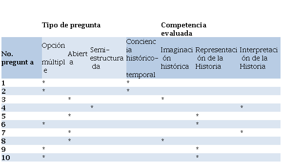 Para poder valorar las acciones y actividades puestas en marcha para la mejora de la práctica, fue necesario aplicar una serie de instrumentos que permitieran valorar el logro del pensamiento histórico en los estudiantes del sexto grado de la escuela primaria, por lo que se decidió que ésta girara en torno al logro de las competencias del pensamiento histórico que maneja Santisteban Fernández A. (2010). Esto se logró a partir de diseñar un cuestionario referente a los temas abordados durante el bloque IV y bloque V de Historia. Cada una de las preguntas correspondía a una de las cuatro competencias del pensamiento histórico, para que de esta forma se pudiera evaluar el cambio y la apropiación de estas competencias por parte de los estudiantes participantes, como se muestra en la tabla 4.