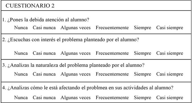 El segundo cuestionario evalúa las intenciones del tutor para escuchar con atención y analizar la situación o problemas que presente el alumno, 6 de 10 alumnos contestaron Casi siempre de un promedio de 10 a 12 preguntas mientras que cuatro contestaron Frecuentemente y 2 algunas veces. En cuanto a los tutores, 7 contestó casi siempre y 2 contestó Frecuentemente y uno Algunas veces.