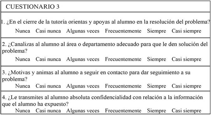 En el tercer cuestionario el 80% de los alumnos piensan que solamente algunas veces reciben la orientación que ellos necesitan, mientras que el 20% dijo que regularmente reciben el apoyo adecuado a la resolución de sus problemas. Por otro lado, 70% de los tutores respondieron que frecuentemente proporcionan la orientación y canalización de apoyos a los alumnos, mientras que el 30% opinó que lo hace casi siempre.