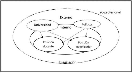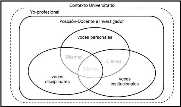 Si bien para el análisis de los datos se emplea la propuesta de Hermans (2014), sólo se retoma el dominio interno, pues el externo se encuentra representando en las experiencias que los sujetos narran sobre sí mismos y el ámbito en el que se desenvuelven. Por otra parte, como ya se mencionó, se abordan dos de las posiciones más importantes: la de docente e investigador, ambas conformadas por un conjunto de voces que se agrupan en tres bloques o áreas: personal, disciplinar e institucional; y de manera paralela, se estudian las divergencias, conflictos y dilemas que se desarrollan entre estas estructuras cada vez que se confrontan o reorganizan. Para una mejor explicación de este proceso, se elaboró la siguiente figura.