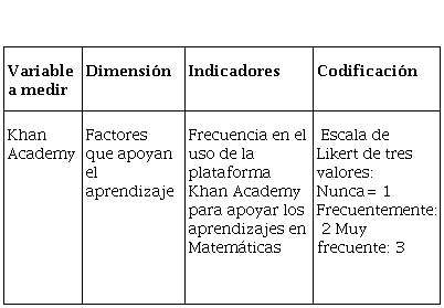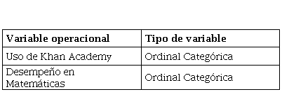 En este sentido se definió el uso de Khan Academy como la variable independiente (X) y el rendimiento de los alumnos en pruebas a gran escala del campo disciplinar de matemáticas como la variable dependiente (Y) siendo: