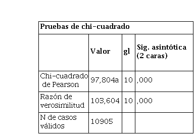 Así mismo, señalar que la razón de verosimilitud es de 103,604, tiene asociada una probabilidad de significancia asintótica igual a 0 que como es menor a 0,05, conduce a rechazar la hipótesis nula, concluyendo que existe dependencia entre las variables analizadas.