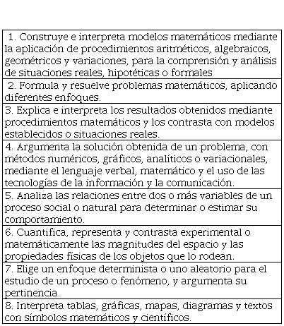 El Acuerdo secretarial 444 establece que las competencias reconocen que a la solución de cada tipo de problema matemático corresponden diferentes conocimientos y habilidades, y el despliegue de diferentes valores y actitudes. Por ello, los estudiantes deben poder razonar matemáticamente, y no simplemente responder ciertos tipos de problemas mediante la repetición de procedimientos establecidos. Esto implica el que puedan hacer las aplicaciones de esta disciplina más allá del salón de clases (SEP, 2008), tal como se muestra en la tabla 1.