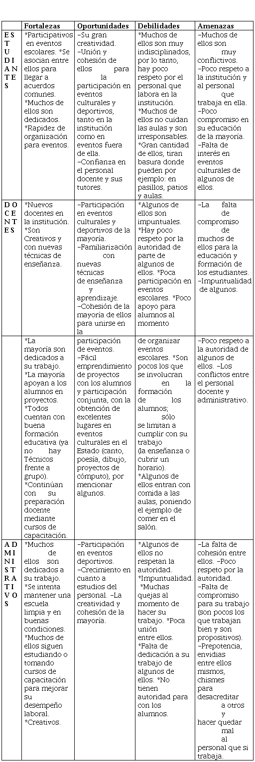 De manera general, podemos decir que se tienen varias fortalezas dentro de la institución, dentro de las cuales se puede destacar la creatividad de alumnos, maestros y personal administrativo. Es importante señalar el amplio espacio o extensión de terreno propio de la institución, lo que permitiría el uso de espacios al aire libre, así como la proyección de otras áreas; cabe señalar que se tiene reconocimiento de muy buena educación a nivel estado.