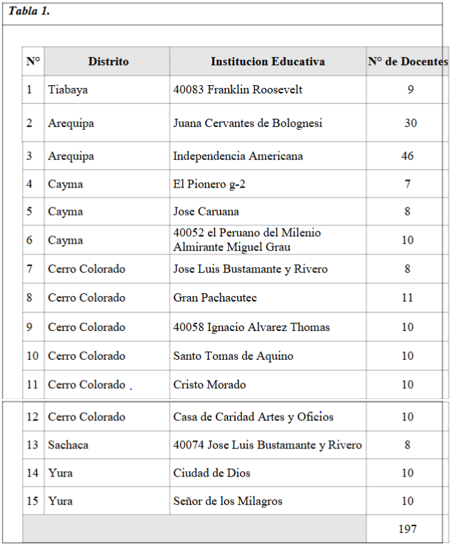 De las 19 instituciones educativas de la provincia de Arequipa, la muestra de la investigación está constituida por 197 docentes de 15 Instituciones Educativas con Jornada Escolar Completa de la provincia de Arequipa - UGEL Norte.