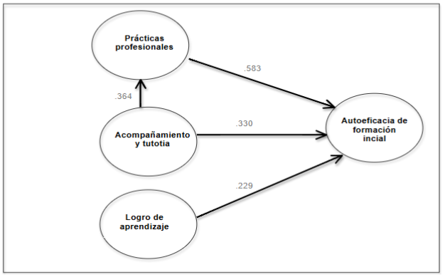 En esta investigación, el modelo que se obtuvo a partir de regresiones lineales identifica tres variables estructurales que afectan la autoeficacia de formación del futuro docente (variable dependiente), las otras variables que afectan a ésta son: prácticas profesionales, acompañamiento/tutoría, y logro de aprendizaje de alumnos (variables independientes). El hallazgo de las variables que explican a la variable dependiente indica que la autoeficacia que tiene el futuro docente no se da por si sola, sino que ésta se permea de las acciones que existen a su alrededor durante su formación inicial.