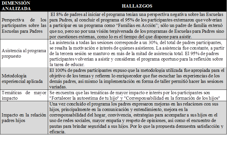 Partiendo de estos resultados y en contraste con los estudios revisados que han pretendido hacer una propuesta diferente de Escuela para Padres alejándose de sólo conferencias, se encontraron resultados similares en el sentido de que la implementación de una Escuela para Padres desde una visión de padres y madres activos y autorreflexivos favorece su participación y su involucramiento con sus hijos y con la escuela.