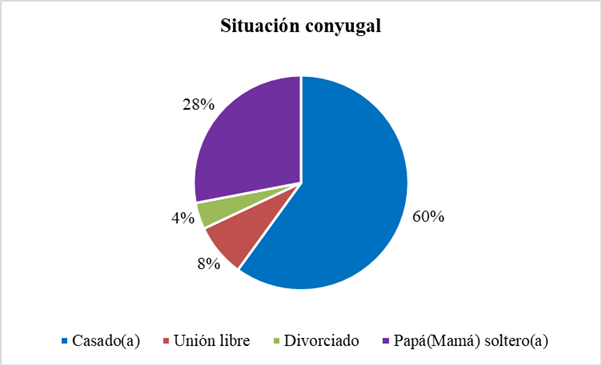 De la encuesta realizada para recabar información de las familias y alumnos, fueron 25 padres del total del grupo participante quienes respondieron, se encontró que el 93% de los participantes fueron madres y sólo el 7% correspondió a padres. Respecto a la situación conyugal de los padres y madres, los datos apuntan a que el 62.5% están casados, 29.2% es padre o madre soltero(a) y sólo el 8.3% se encuentra en unión libre.