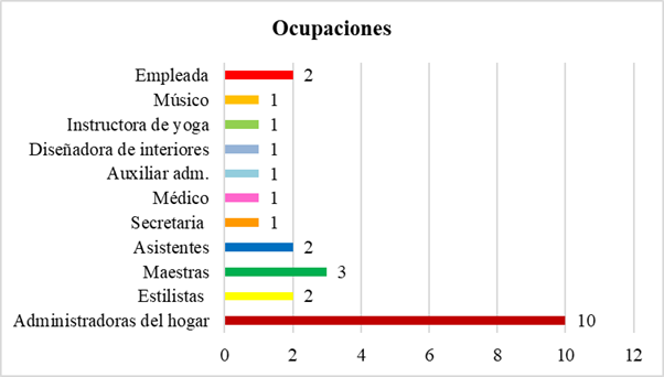 La escolaridad de los padres participantes resultó diversa, siendo la mayoritaria de educación superior (licenciatura), seguida del bachillerato y el nivel de educación básica. Las ocupaciones de los padres son variadas y van desde administradoras de su hogar hasta maestras, secretarias, músicos, odontólogos, etc., como se muestra en la gráfica 2.